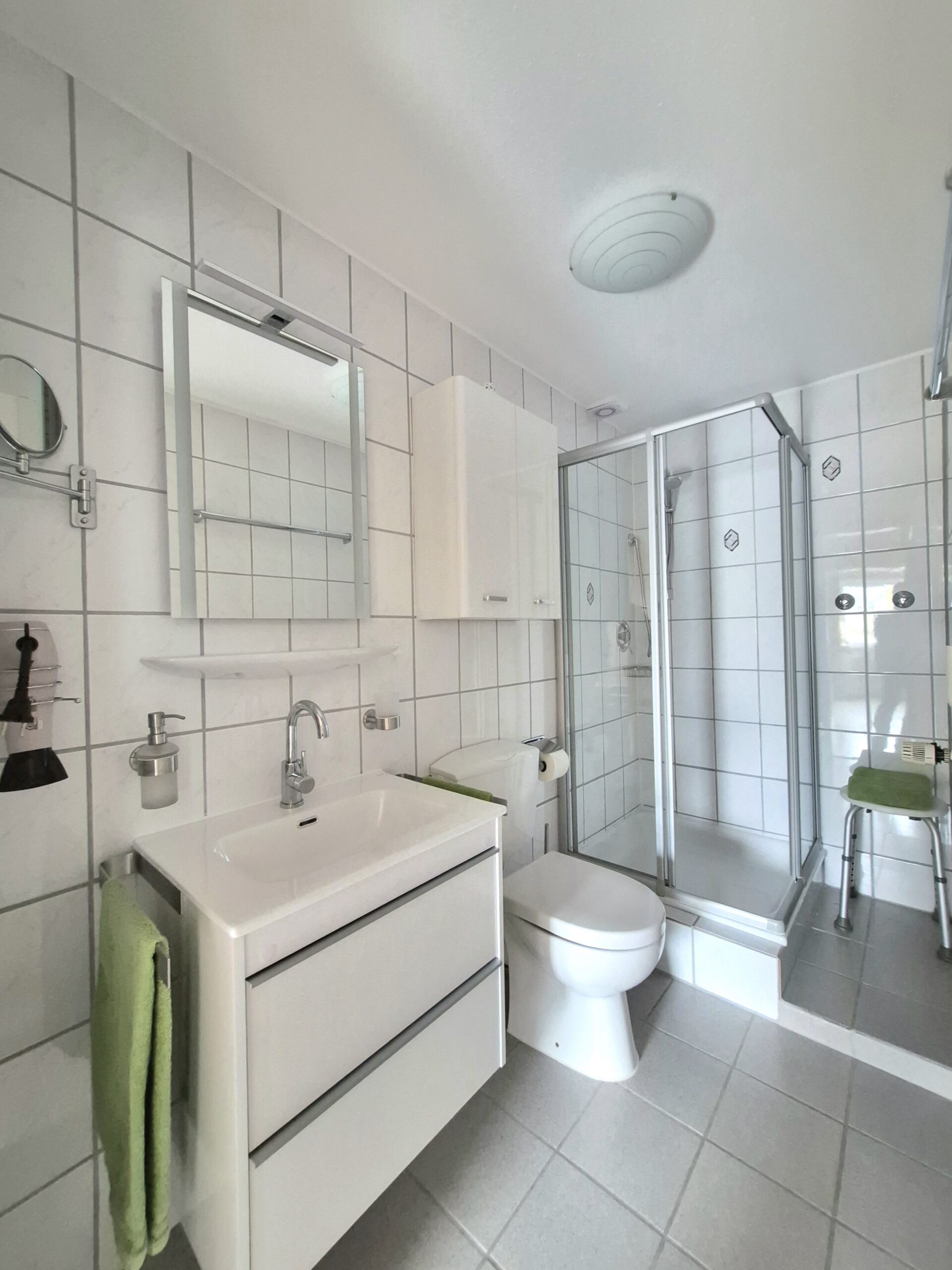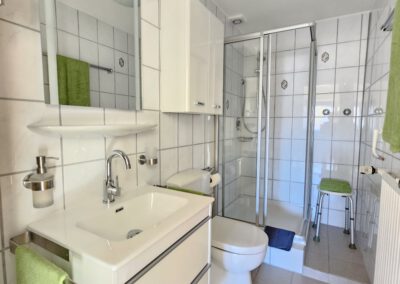 Niedriger Duscheinstieg, Hand- & Duschtücher, Föhn, Kosmetikspiegel – alles für einen angenehmen Start in den Tag.